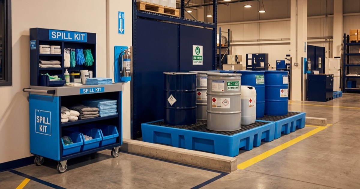 The practical side of ISO 14001 — spill kits, secondary containment, labeling, and the facility walk-through that prevents findings.
